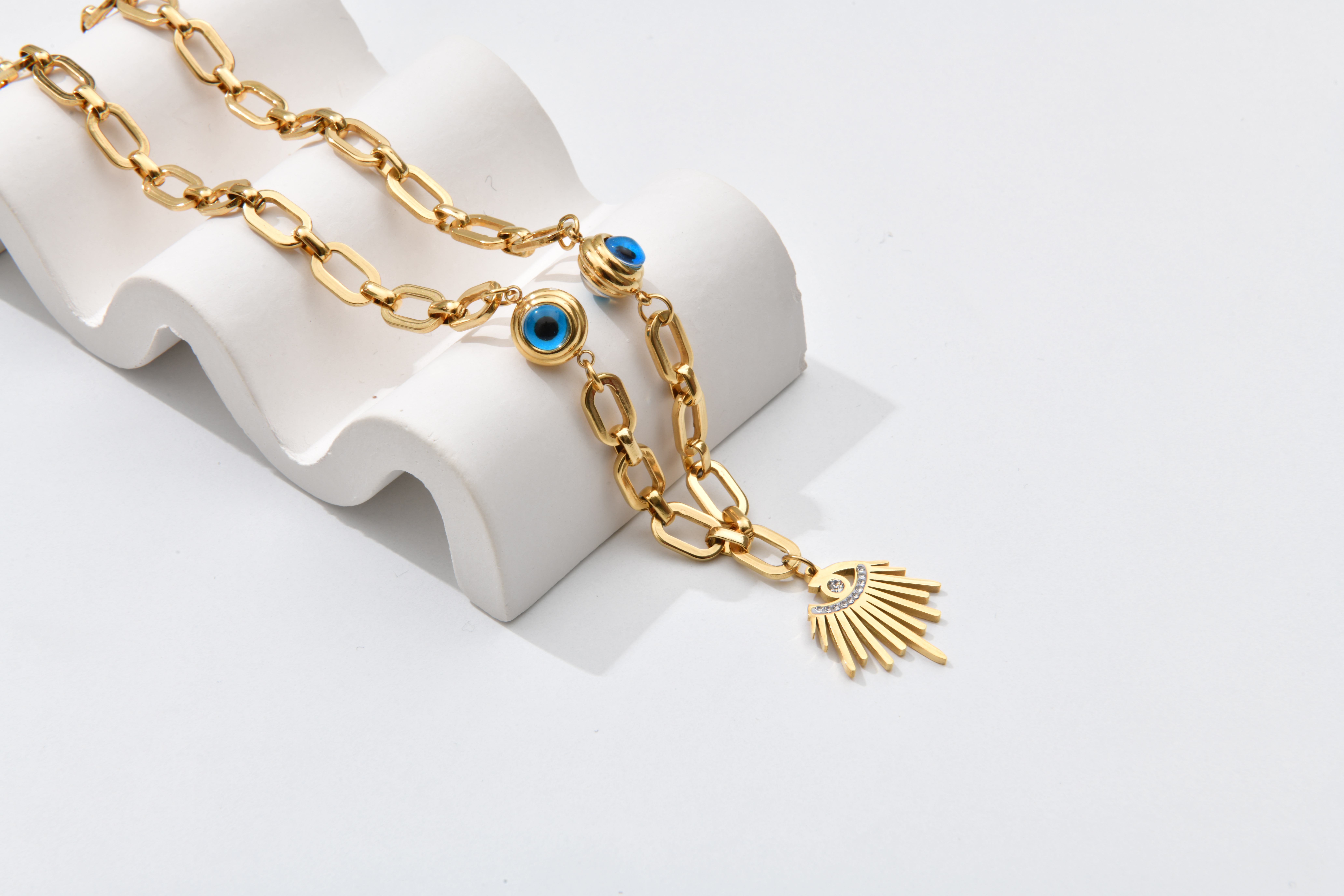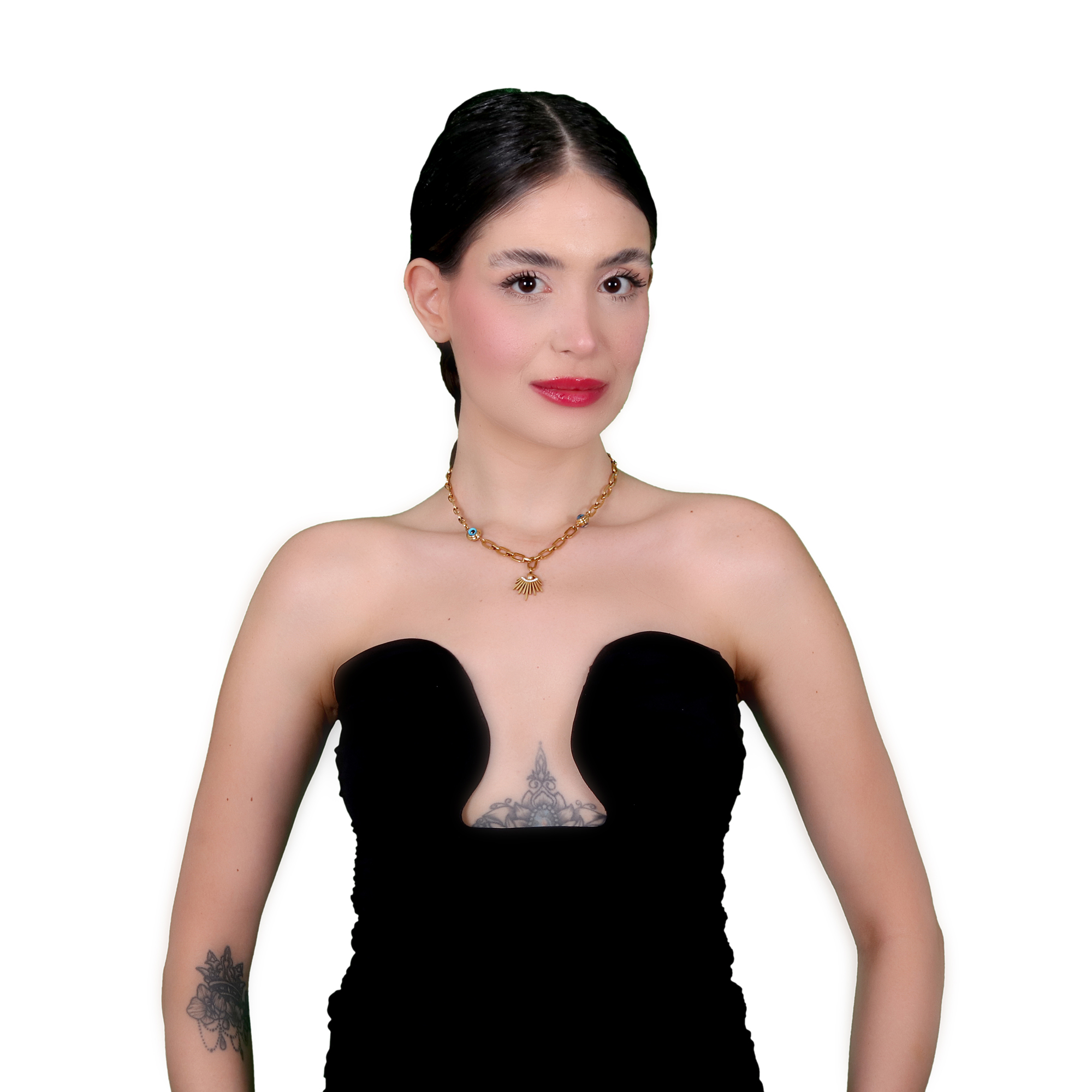 gücünü sembollerden alan, stilini enerjilerle tamamlamak isteyen ruhlara hitap eder. Zincirin sağlam halkaları birliği simgelerken, üzerindeki nazar boncuğu kötü enerjiden korur, ay figürü sezgileri, ışın figürü ise içsel aydınlanmayı temsil eder. Gündüz stilinize karakter, gece kombinlerinize anlam katar. Bu kolye; hem stil sahibi hem bilinçli bir duruşun ifadesidir.