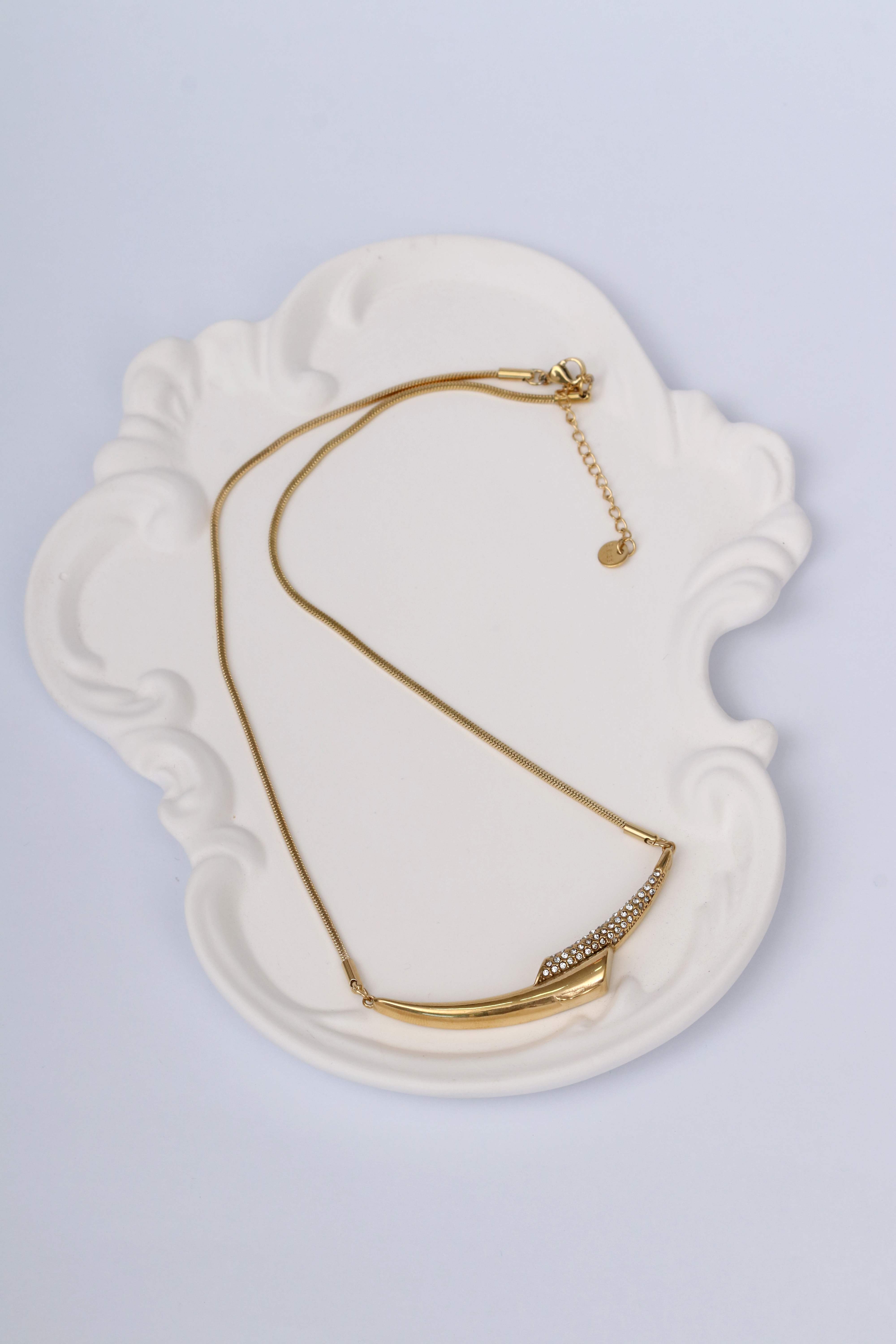 Altın bir nehir gibi, zarifçe kıvrılarak boynunuzu saran bu tasarım; parıltılı taş geçişiyle ışığın yönünü değiştiriyor.