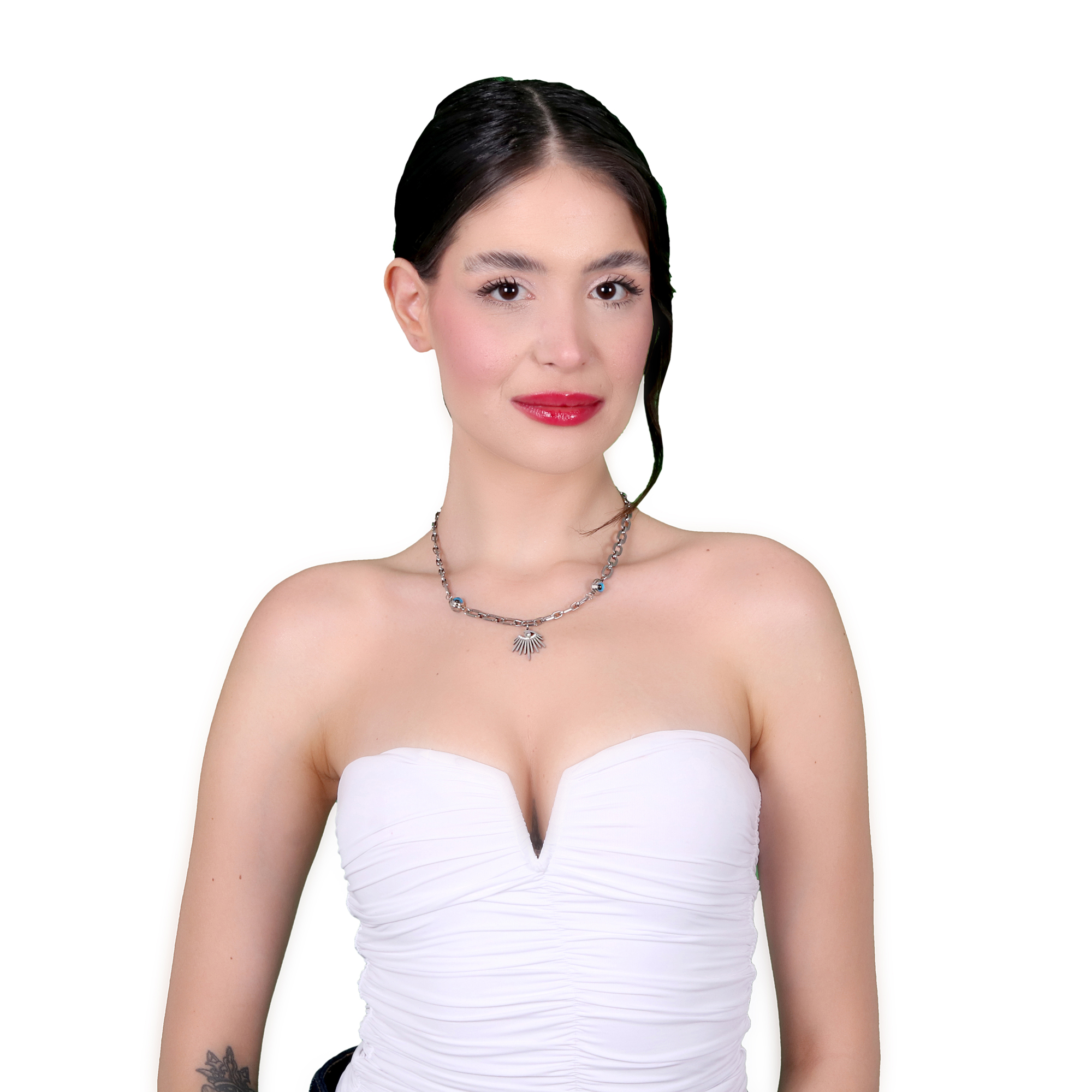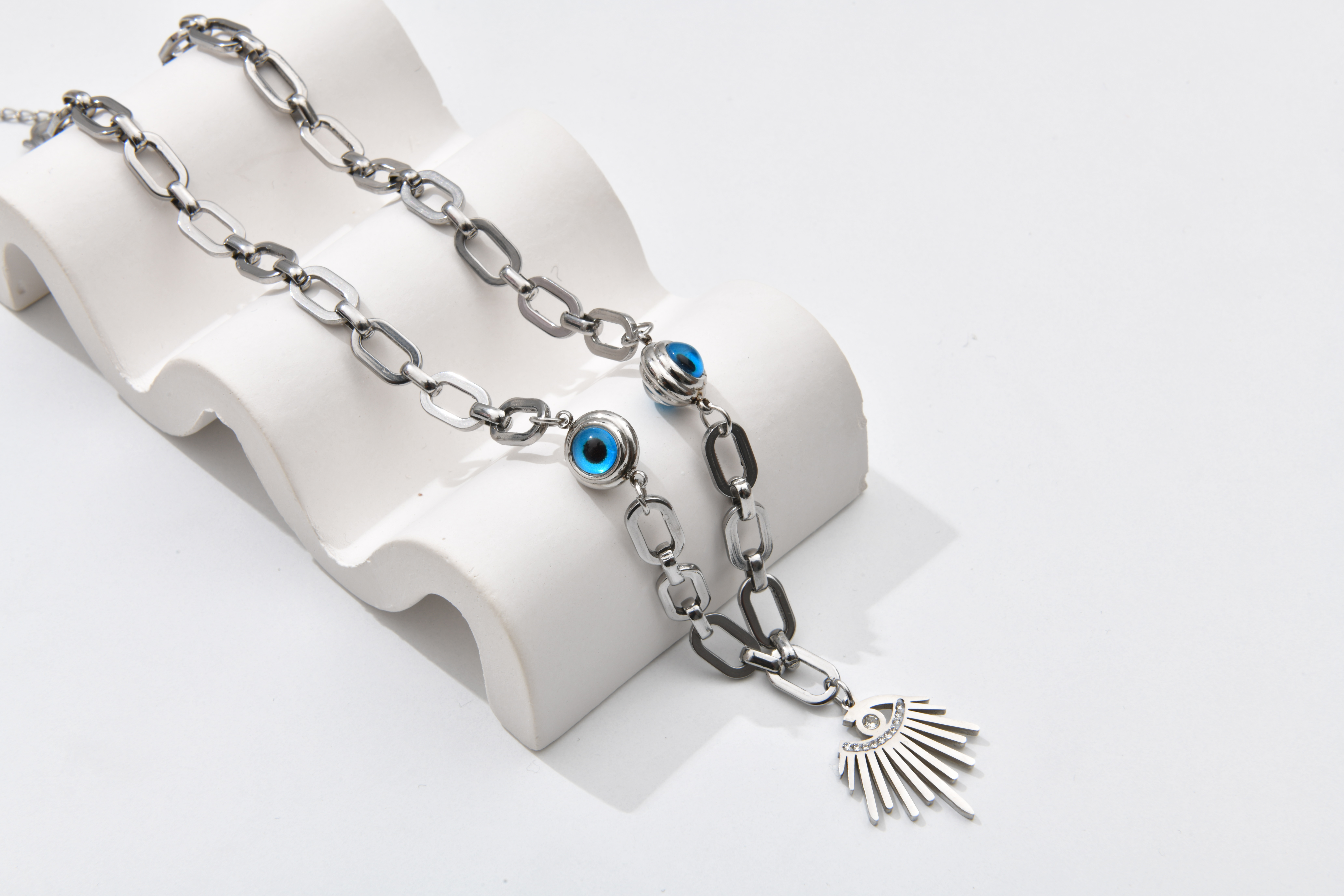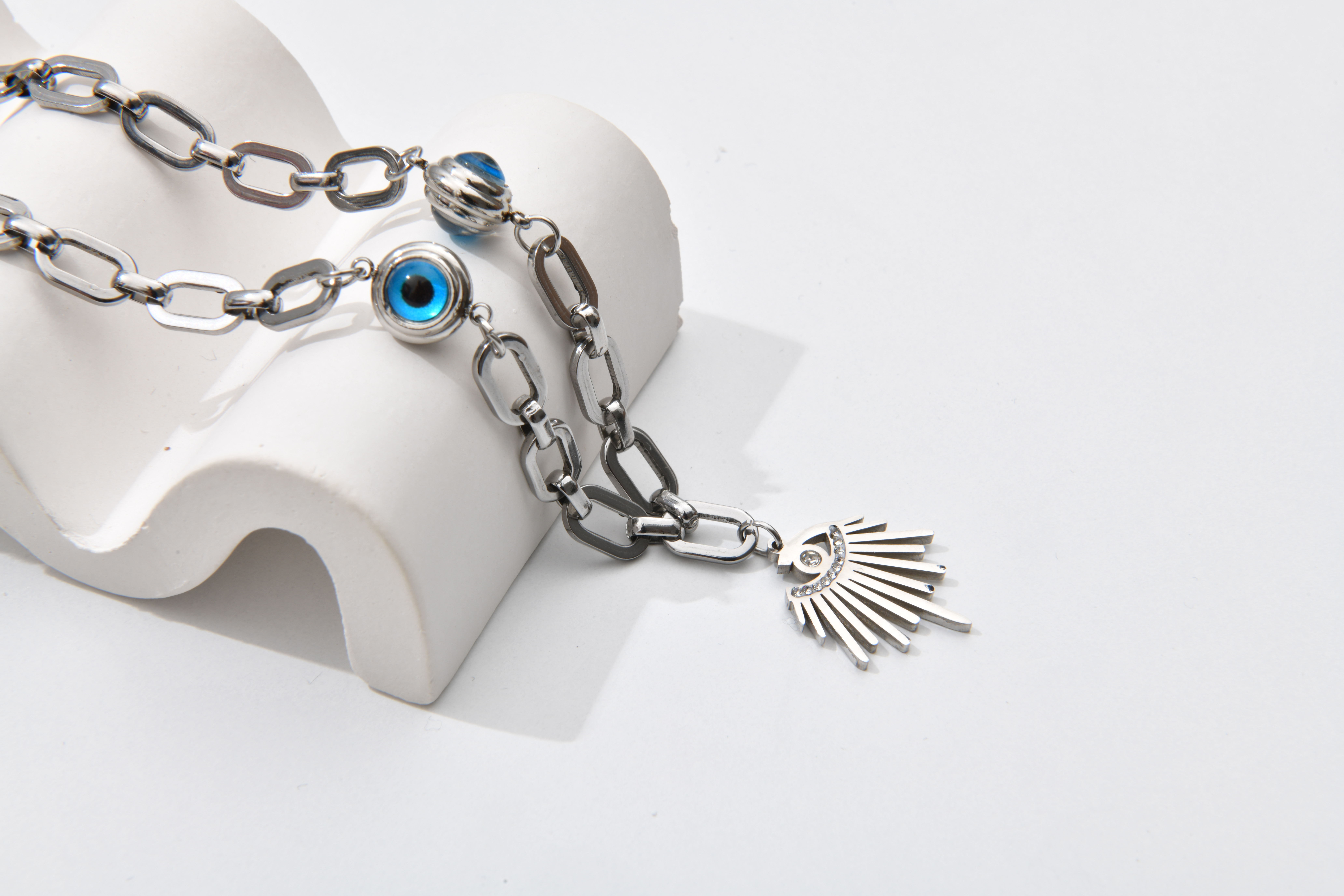 mistik sembolleri modern bir yorumla sunan cesur bir kolyedir. Soğuk metalik tonda zincir halkaları, kararlı bir stilin habercisi. Nazar boncuğu, ay figürü ve ışın detayı; bu zincirin yalnızca bir aksesuar değil, aynı zamanda bir koruyucu parça olduğuna işaret eder. Hem günlük stilinize hem de minimal şehirli kombinlere kolayca uyum sağlar. Güçlü, stil sahibi ve dikkatli olanların tercih edeceği bir imza parça.