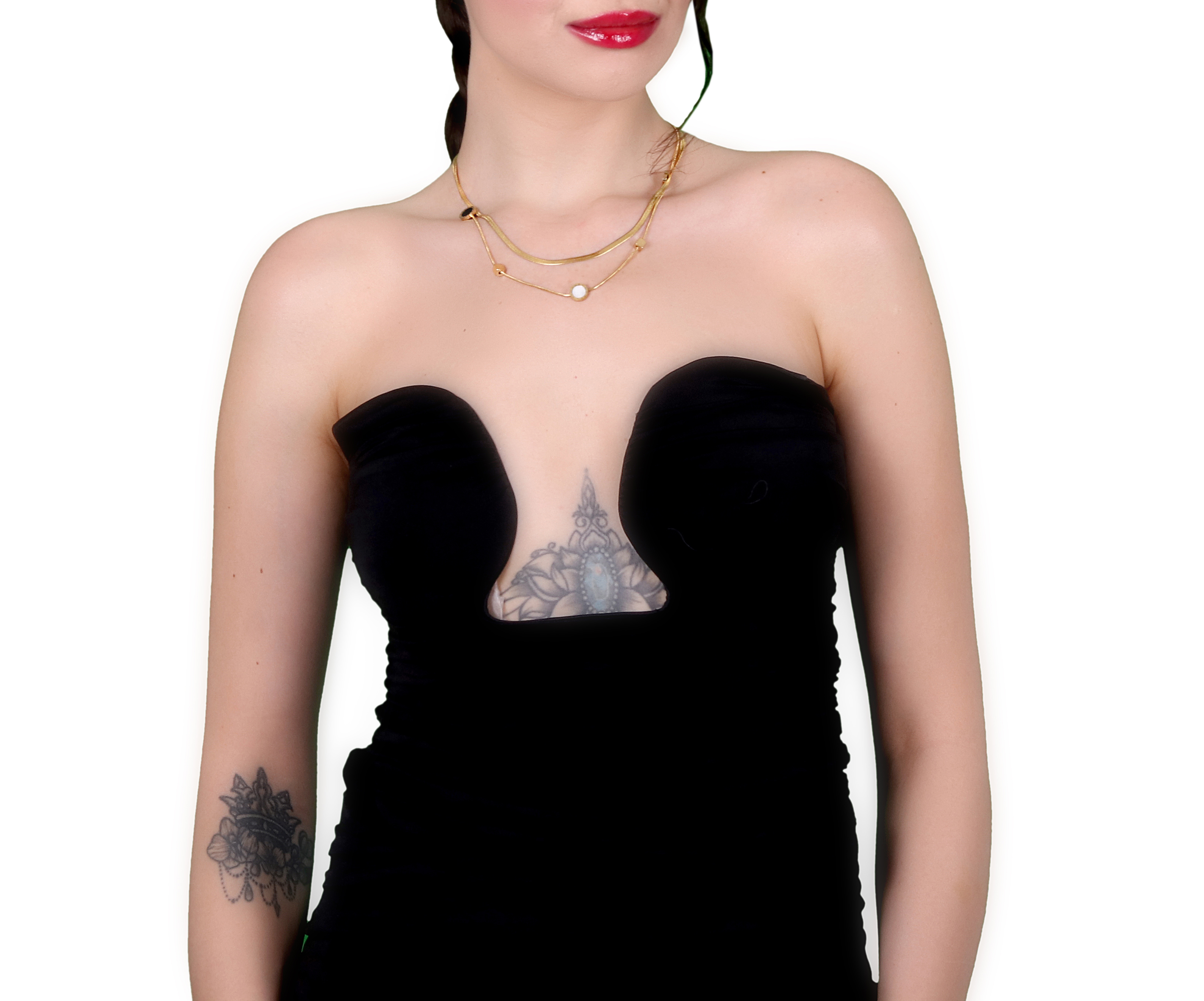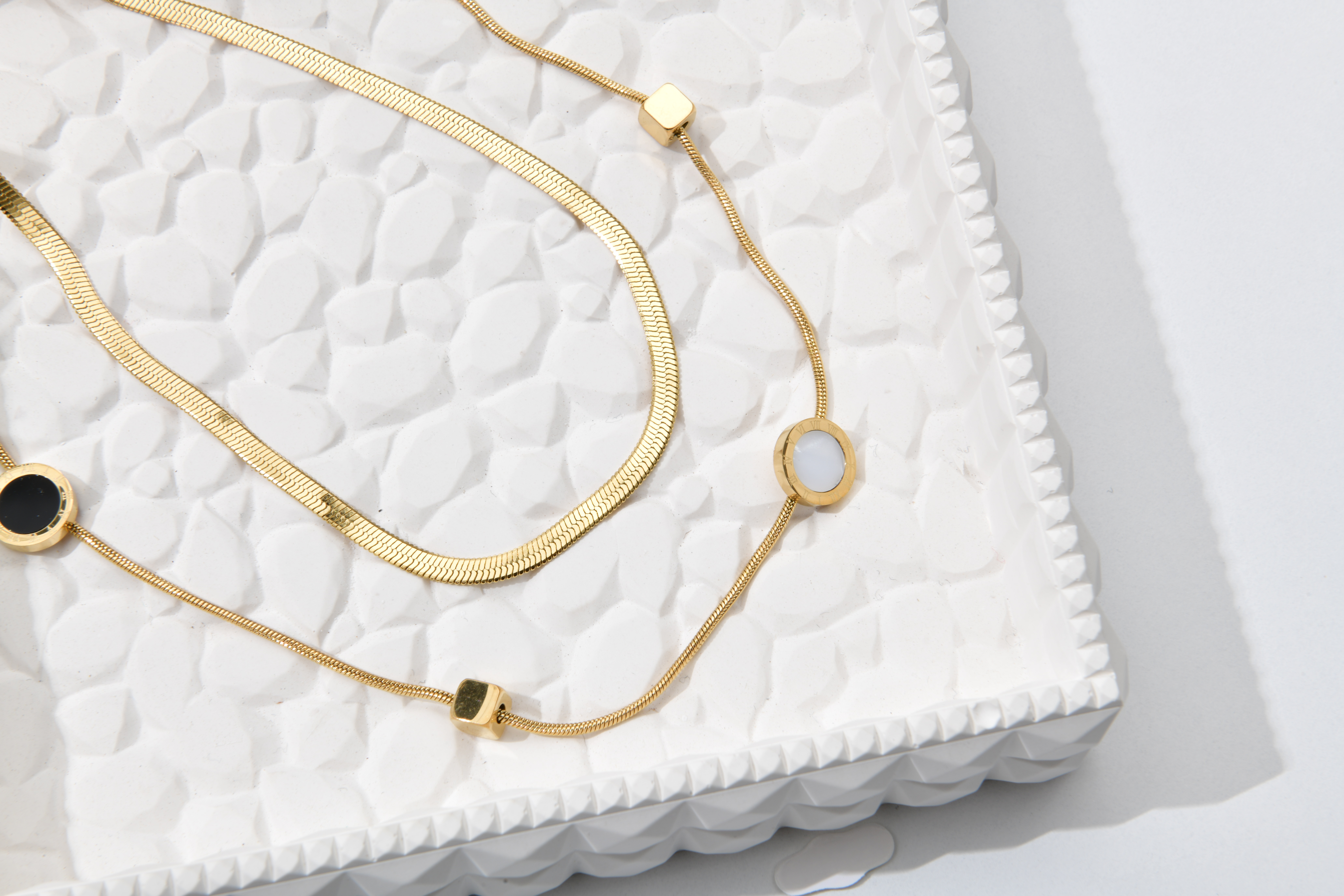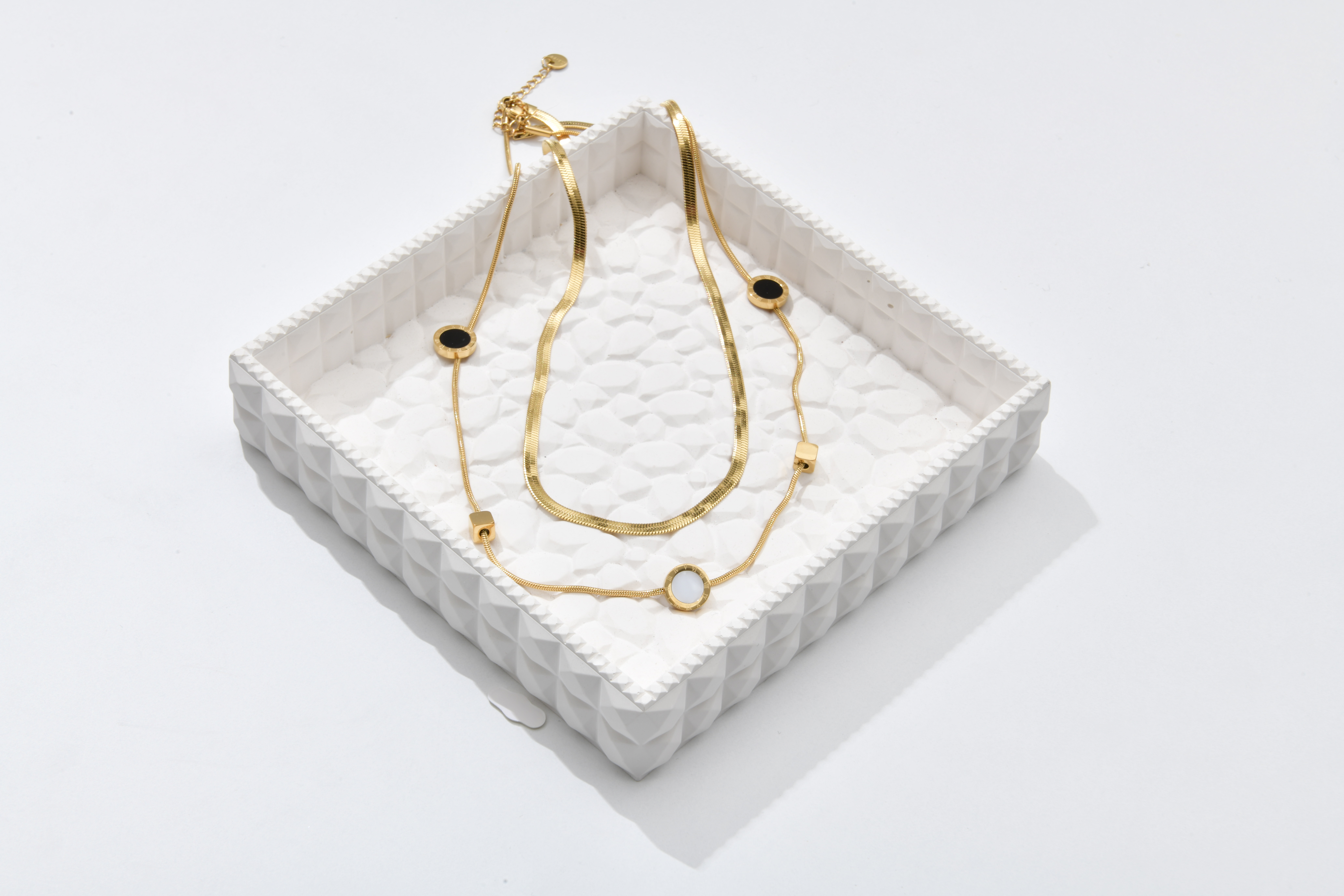 Zarafeti altın tonlarında yaşamak isteyenler için “İkiz Akış – Gold”, şıklığı ve dengeyi bir arada sunuyor. İki farklı zincirin dansı; hem parlak hem sade, hem modern hem klasik… Dairesel detaylar ve geometrik formlar, bu kolyeye zamansız bir karakter kazandırıyor. Günlük stilinize altın bir dokunuş, özel gecelere ise tamamlayıcı bir ışıltı.