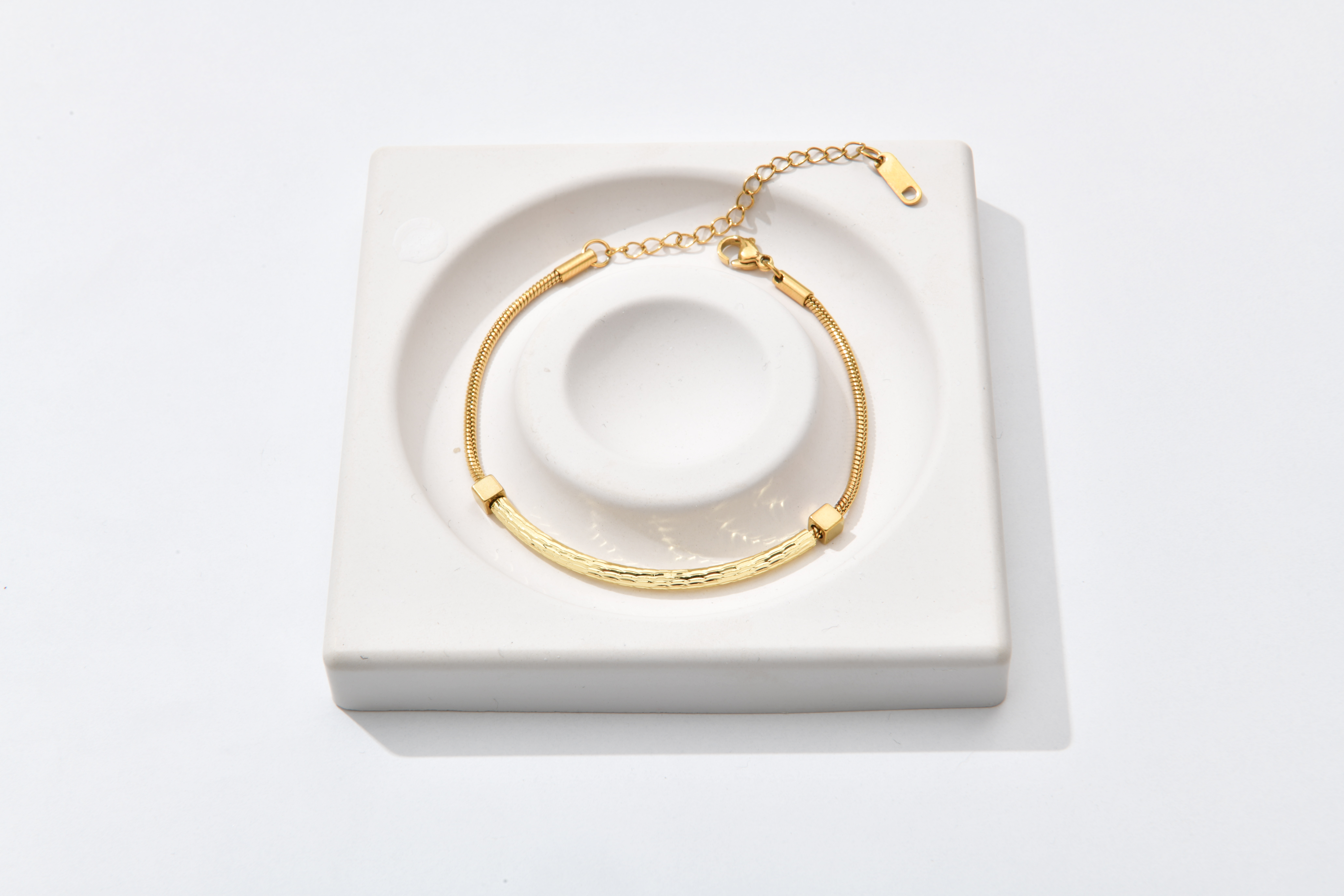 Zarif detaylarıyla öne çıkan Işık Bileklik, altın renkli ince zinciri ve dokulu parlak merkeziyle sade ama dikkat çekici bir görünüm sunar. Gündüz kombinlerinize şıklık, gece stillerinize zarafet katacak bu bileklik, sade stil severler için zamansız bir tamamlayıcıdır. Ayarlanabilir yapısı sayesinde bileğinize tam uyum sağlar.