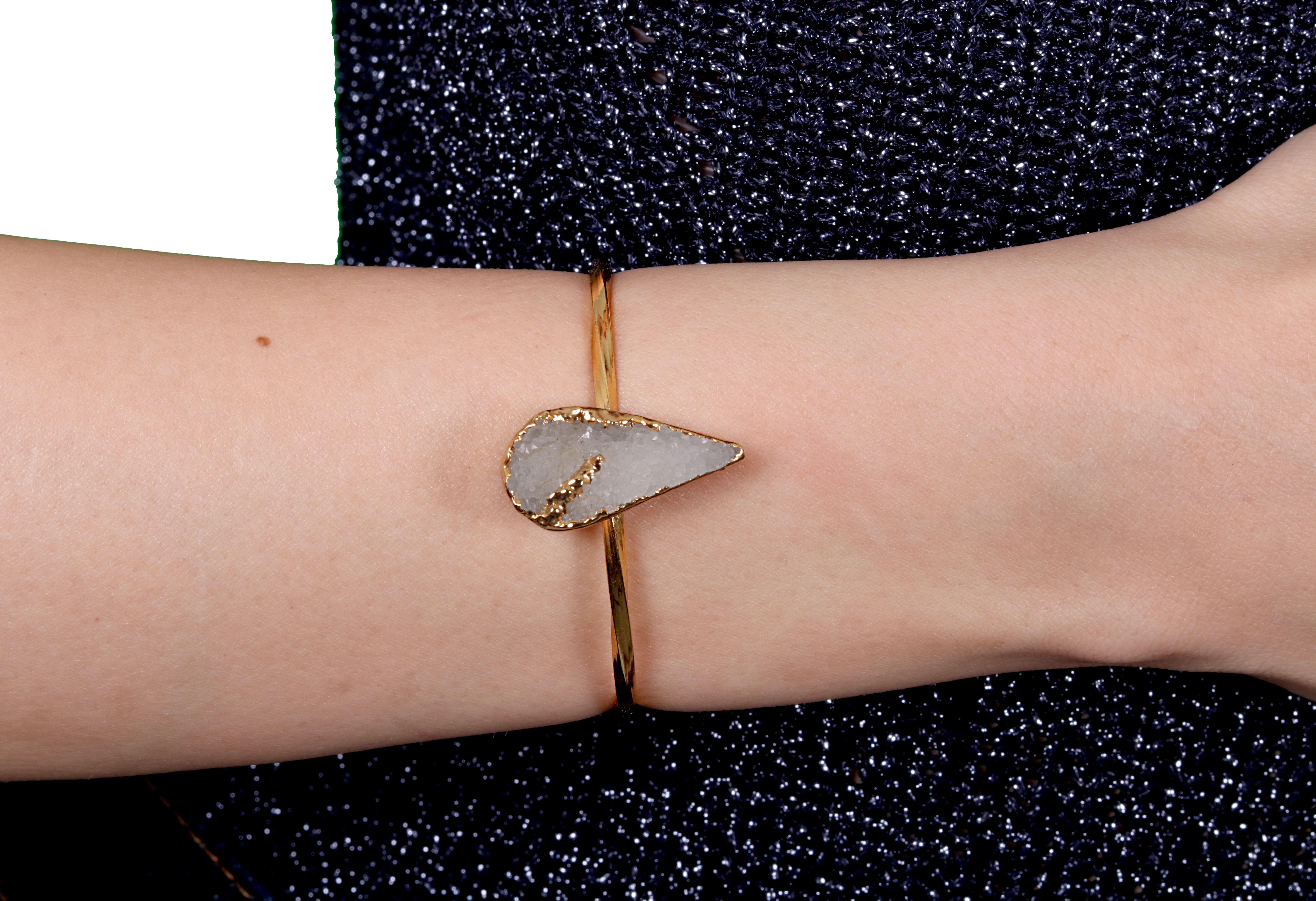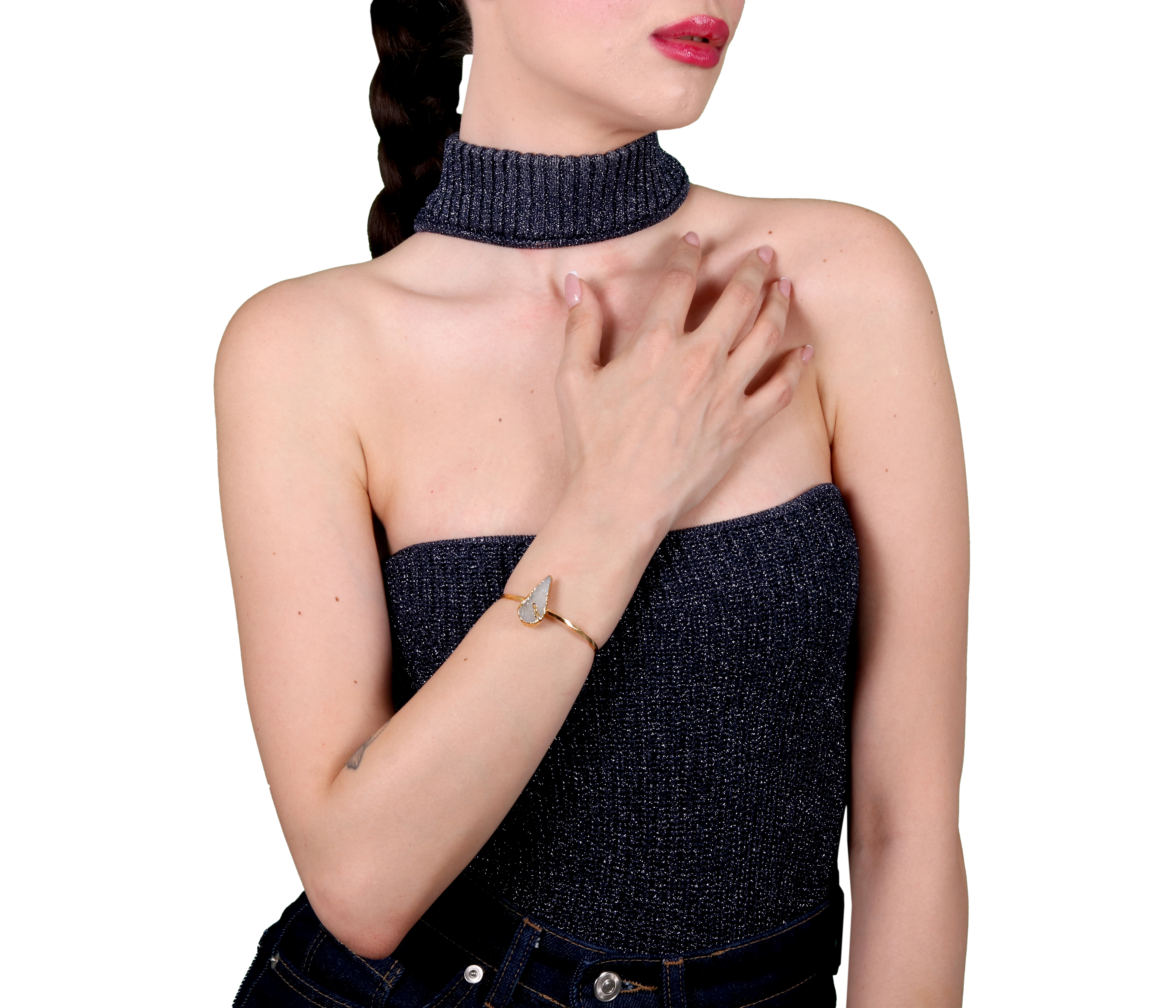 yönünü bilenlerin ve hedefe odaklananların bileklerinde taşıyabileceği bir semboldür. Altın tonlu ince metalin zarif çerçevesi, uç kısmındaki beyaz sivri taşla birleştiğinde bir pusula gibi hissettirir. Taşın doğal ve işlenmemiş formu, doğallığı ve kararlılığı simgeler. El yapımı dokusuyla her biri farklı karakter taşır. Bu bileklik, sessiz ama net bir duruşun zarif ifadesidir.