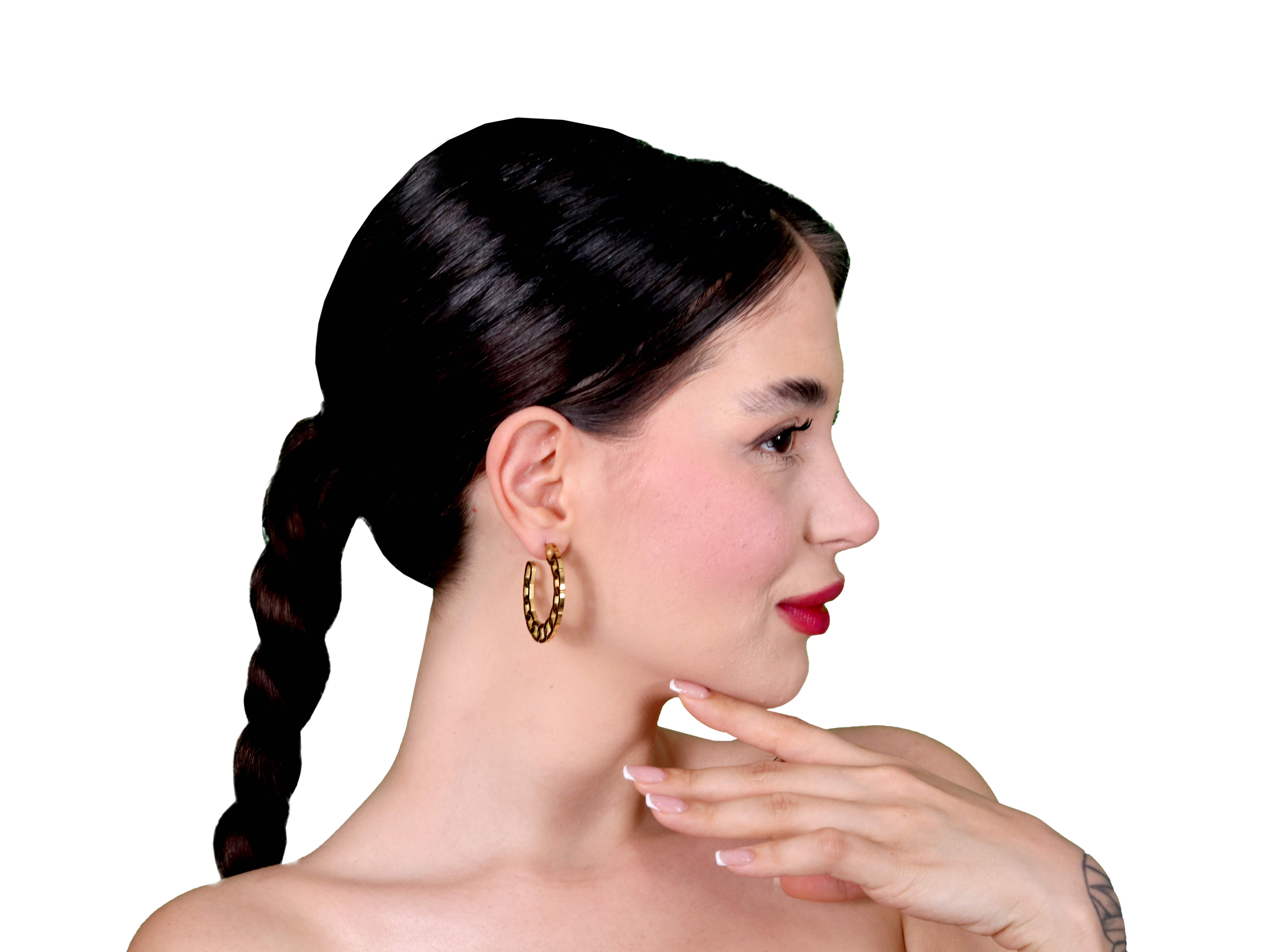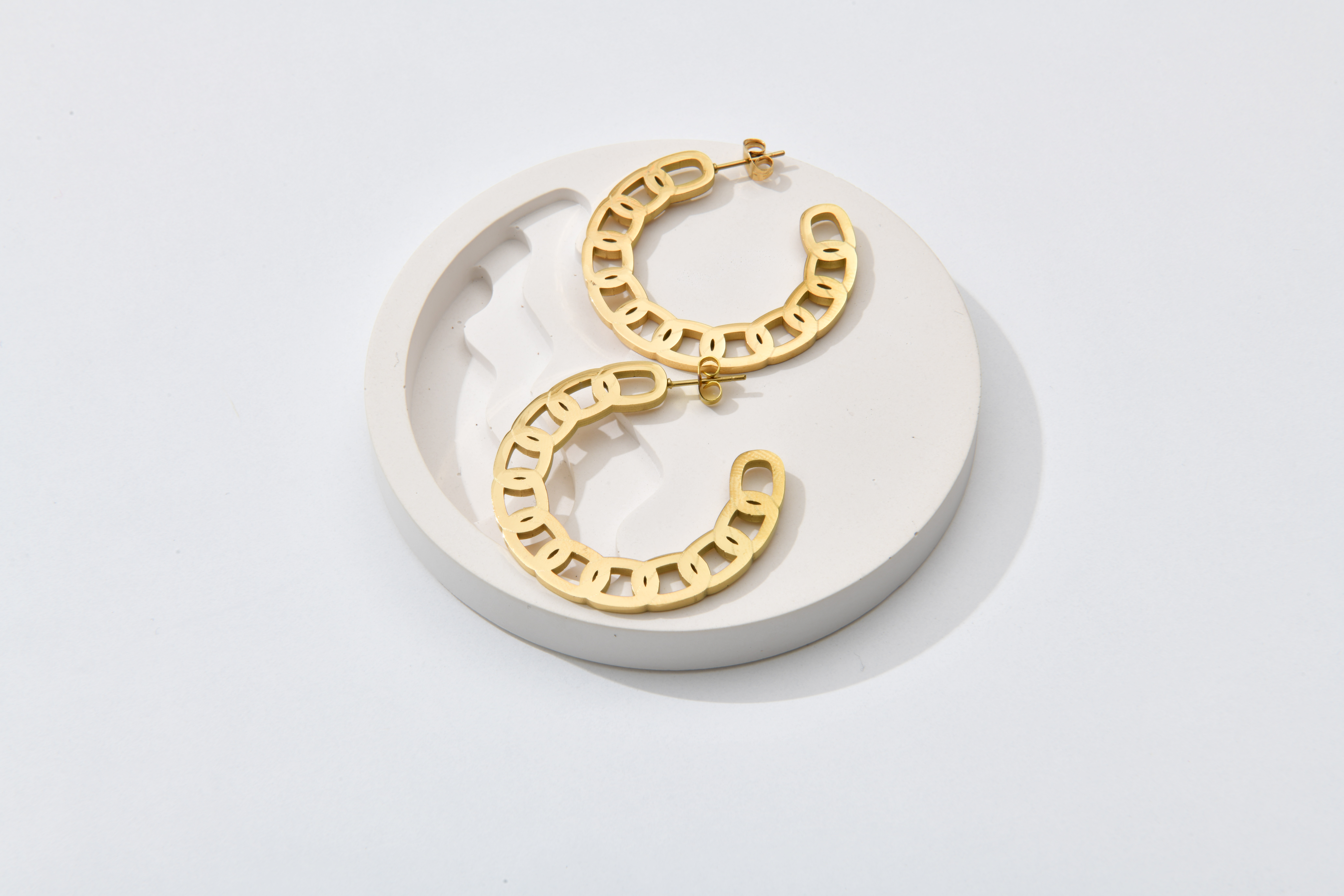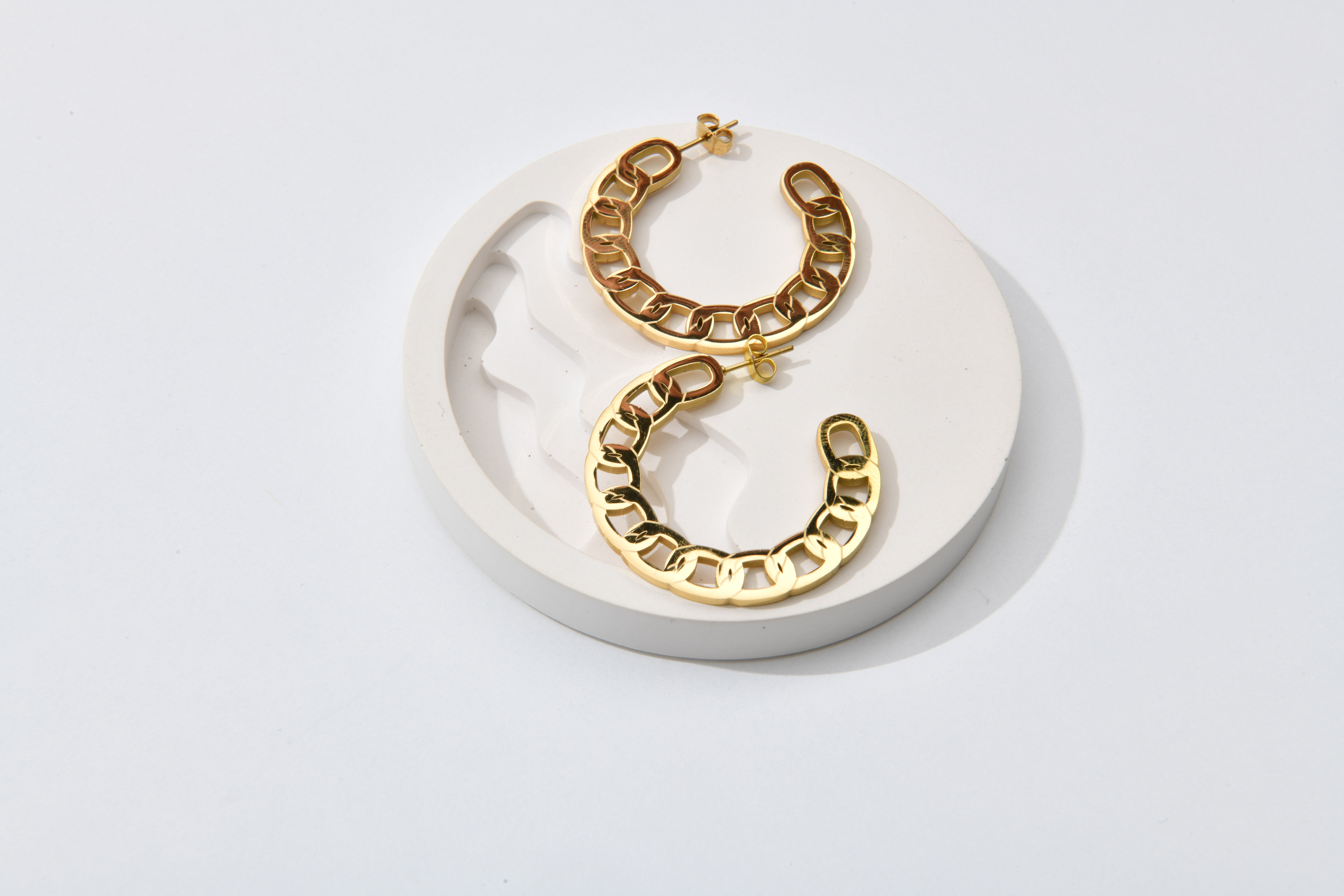 Keskin hatları ve yassı zincir formuyla bu küpe, klasik formlara modern bir yorum getiriyor. Gündüz ışıltısına zarif bir dokunuş, geceye ise güçlü bir ifade bırakmak isteyenler için.